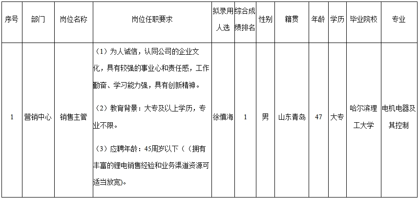 根據(jù)深圳長虹聚和源科技有限公司發(fā)布的招聘公告及招聘相關規(guī)定,經筆試、面試、考察、體檢等程序,擬錄用徐慎海同志到公司營銷中心工作,現(xiàn)予以公示,具體情況如下:
