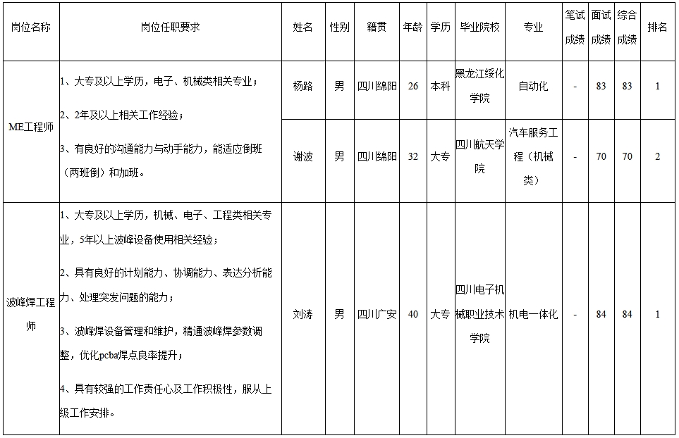 根據(jù)四川九州電子科技股份有限公司發(fā)布的招聘公告及招聘相關規(guī)定,經(jīng)筆試、面試等程序,現(xiàn)將筆試(面試)成績予以公示。