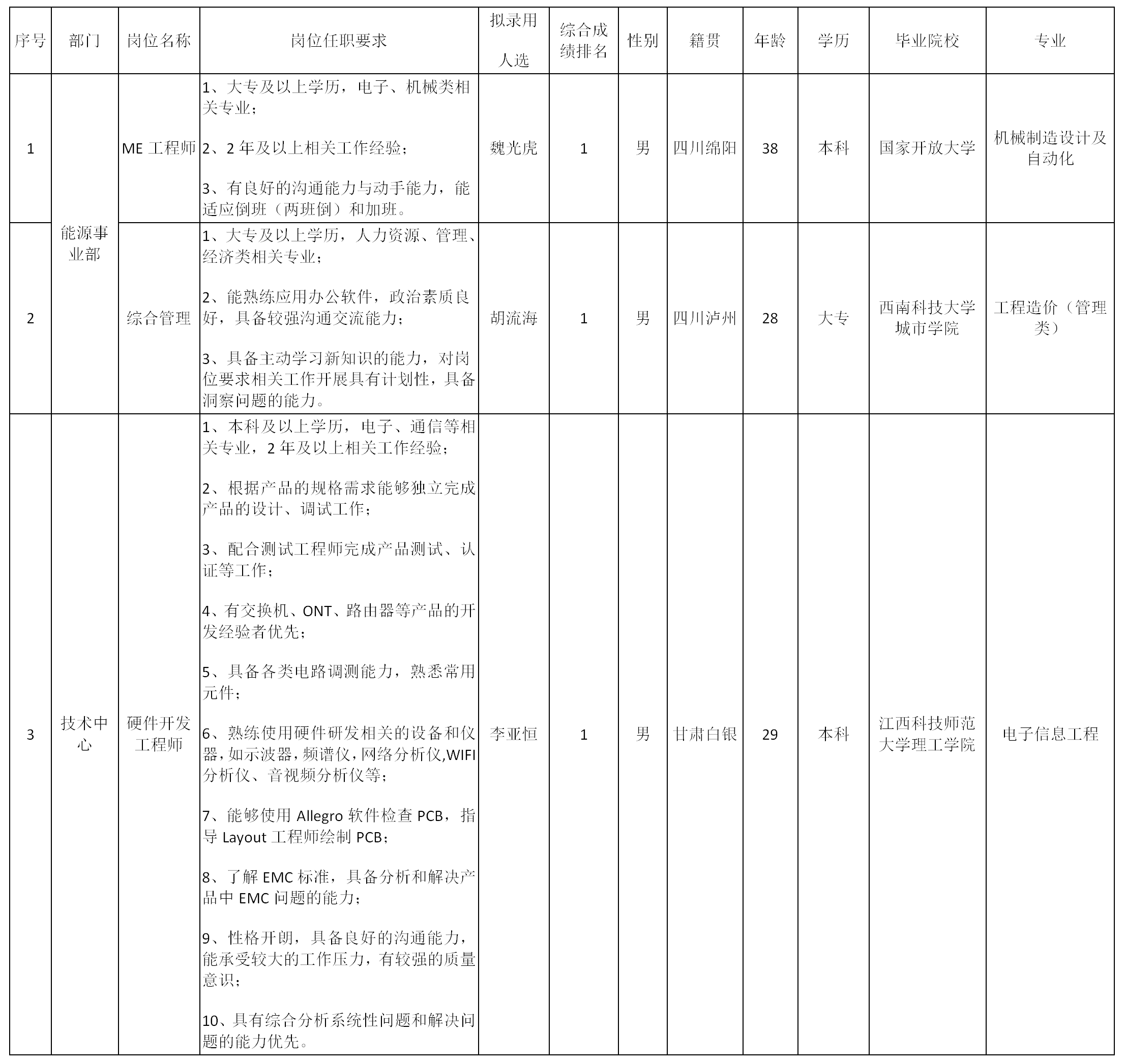 根據(jù)四川九州電子科技股份有限公司發(fā)布的招聘公告及招聘相關(guān)規(guī)定,經(jīng)筆試、面試、考察、體檢等程序,擬錄用魏光虎等3名同志到四川九州電子科技股份有限公司工作,現(xiàn)予以公示,具體情況如下: