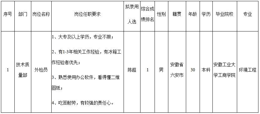 根據(jù)安徽菱安醫(yī)療器械有限公司發(fā)布的招聘公告及招聘相關(guān)規(guī)定,經(jīng)面試、考察、體檢等程序,擬錄用陳超等同志到技術(shù)質(zhì)量部工作,現(xiàn)予以公示,具體情況如下: