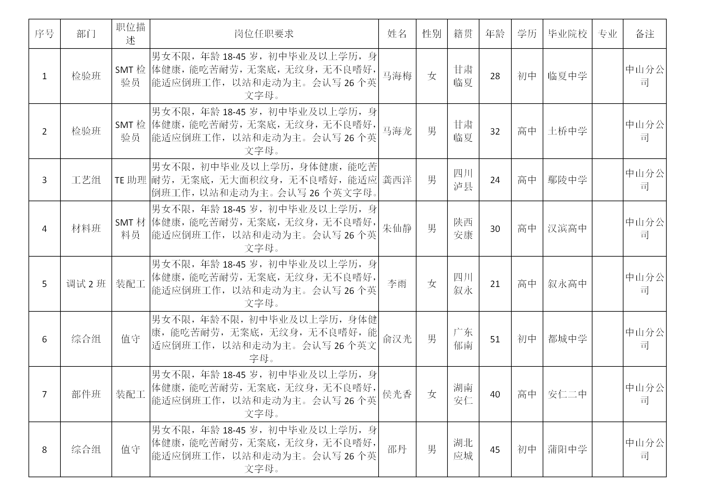 根據(jù)四川長虹精密電子科技有限公司發(fā)布的操作職招聘公告及招聘相關(guān)規(guī)定,從2023年12月1日至2023年12月31日經(jīng)面試、考察、體檢等程序,錄用以下8位同志到四川長虹精密電子科技有限公司操作職崗位工作,現(xiàn)予以公示,具體情況如下: