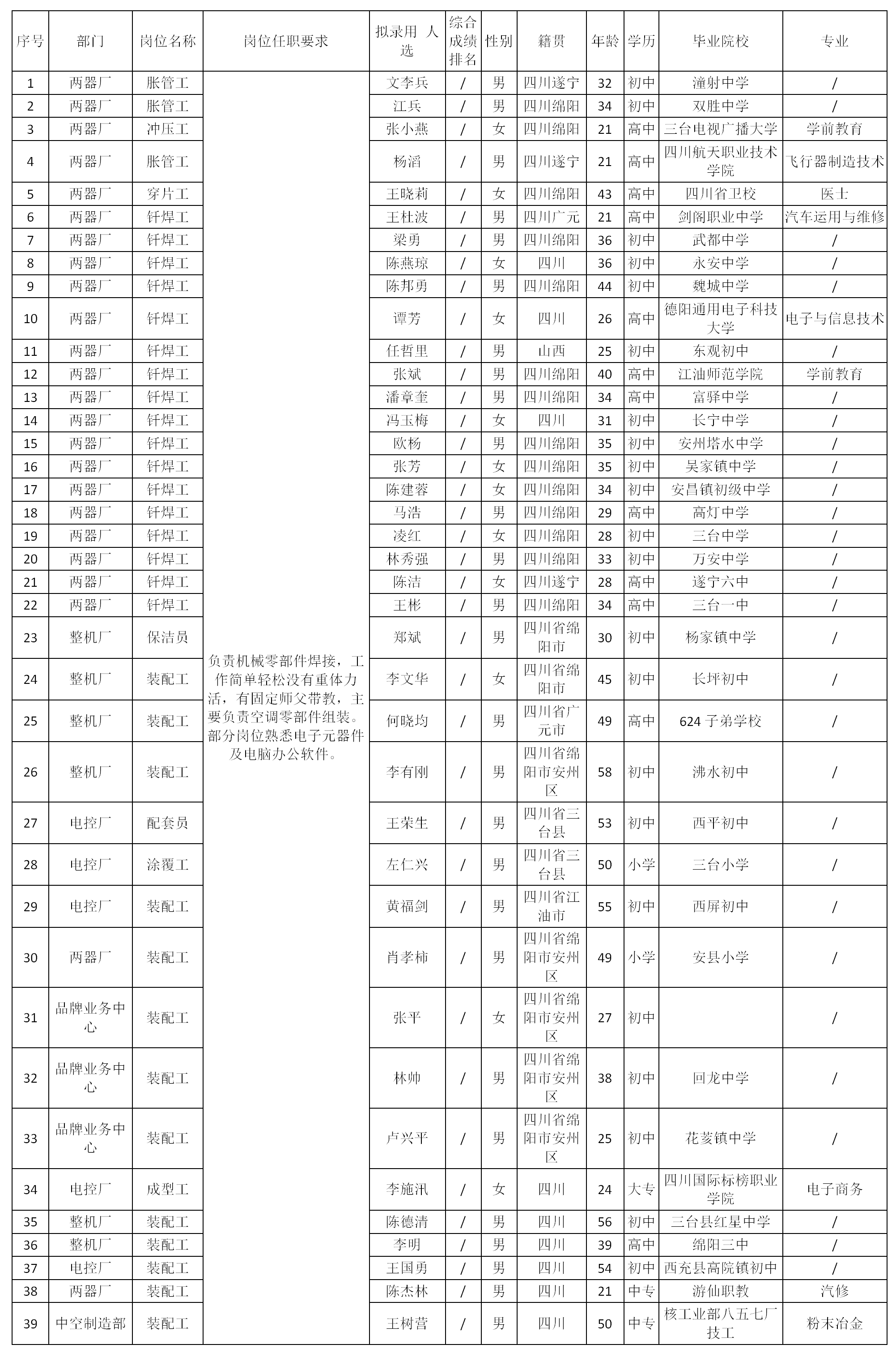 根據(jù)四川長虹空調(diào)有限公司發(fā)布的招聘公告及招聘相關(guān)規(guī)定,經(jīng)面試、考察、體檢等程序,現(xiàn)對擬錄用人員予以公示,具體情況如下: