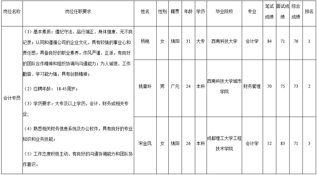 根據四川長虹民生物流股份有限公司發(fā)布的招聘公告及招聘相關規(guī)定,經筆試、面試等程序,現(xiàn)將筆試(面試)成績予以公示。