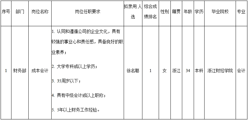 根據(jù)浙江長(zhǎng)虹飛獅電器工業(yè)有限公司發(fā)布的招聘公告及招聘相關(guān)規(guī)定,經(jīng)筆試、面試、考察、體檢等程序,擬錄用徐名聰同志到浙江長(zhǎng)虹飛獅電器工業(yè)有限公司工作,現(xiàn)予以公示,具體情況如下: