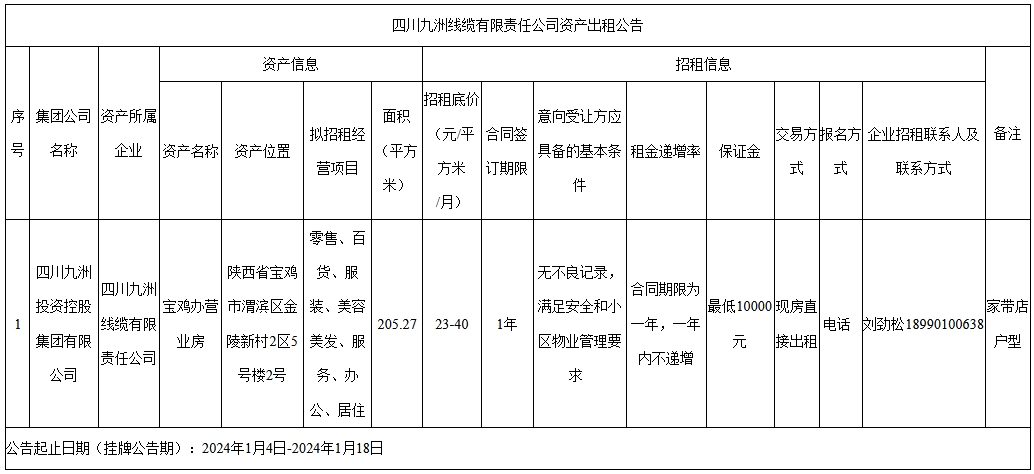 四川九洲線(xiàn)纜有限責(zé)任公司資產(chǎn)出租公告