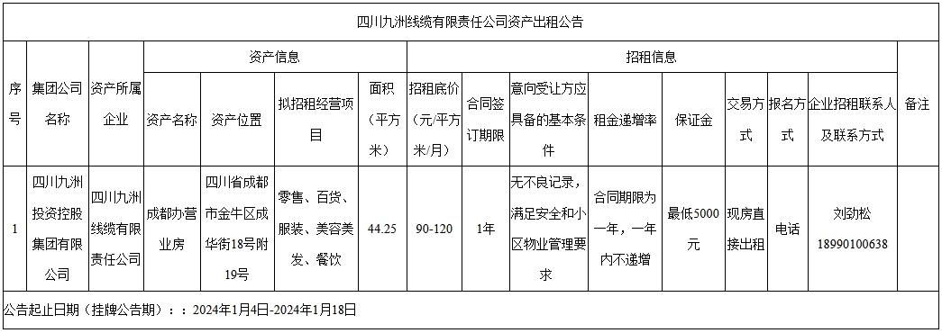 四川九洲線纜有限責(zé)任公司資產(chǎn)出租公告