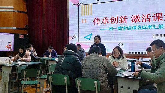 初一數(shù)學(xué)組蔣俊老師作課改成果匯報(bào)。蔣老師以“傳承創(chuàng)新 激活課堂”為主題,詳細(xì)闡述了初一數(shù)學(xué)組課改歷程,總結(jié)了在課改中的收獲,提出了課改中的一些困惑,倡導(dǎo)全體數(shù)學(xué)教師積極參與,共同探討。