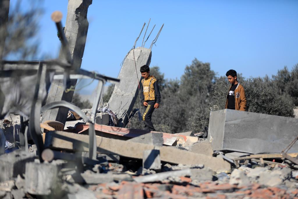 1月7日,在加沙地帶南部城市拉法,人們經(jīng)過以軍空襲后的廢墟。新華社發(fā)(亞西爾·庫迪攝)