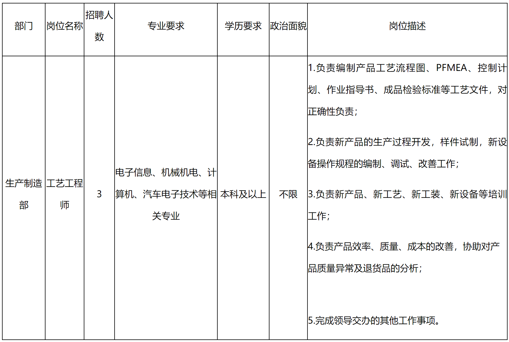 5.工作經(jīng)歷:具有工藝工作3年及以上經(jīng)驗(yàn)。