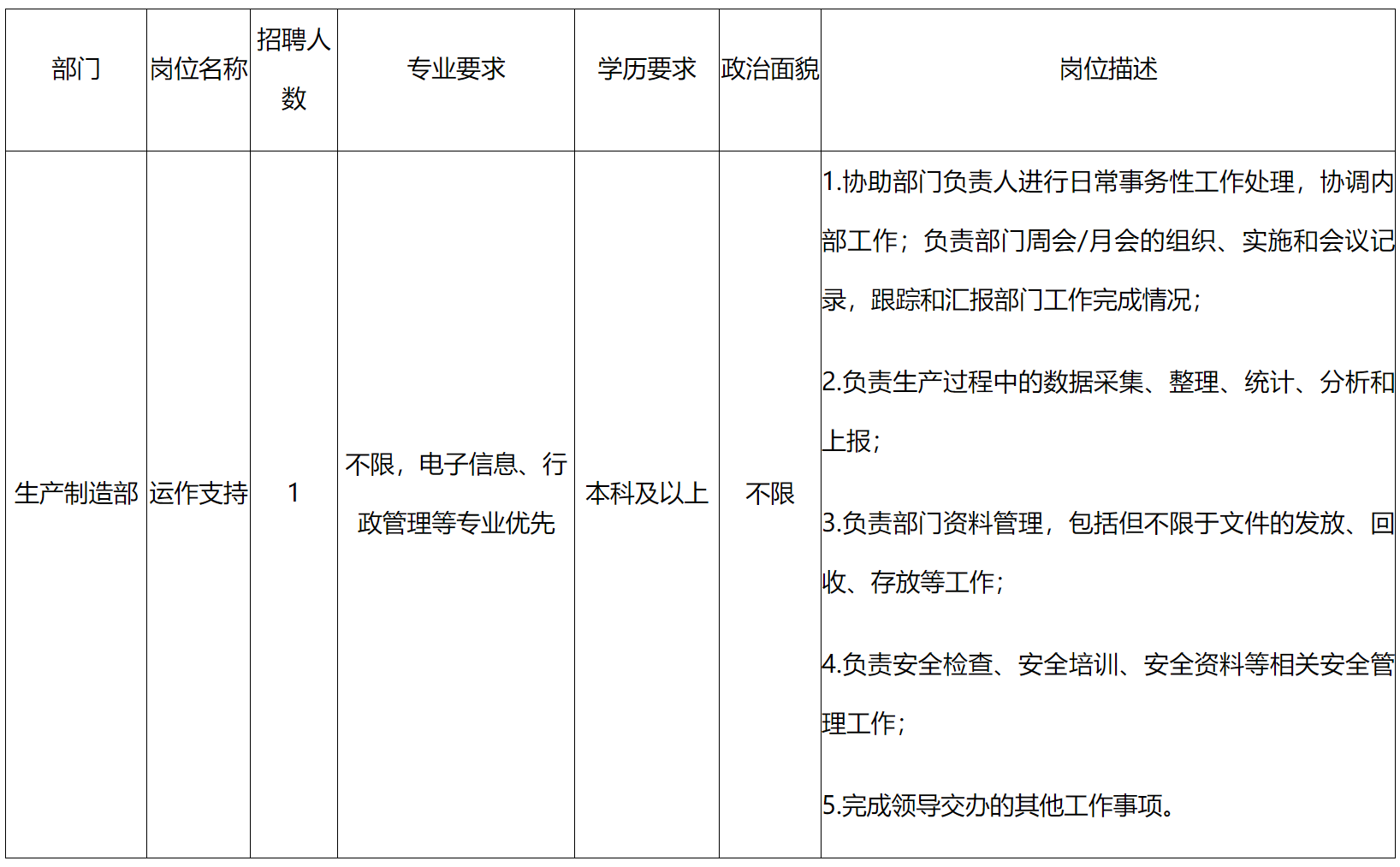 5.工作經(jīng)歷:具有相關(guān)崗位工作1年及以上經(jīng)驗(yàn),具備生產(chǎn)制造行業(yè)經(jīng)驗(yàn)的優(yōu)先。