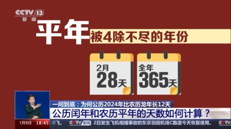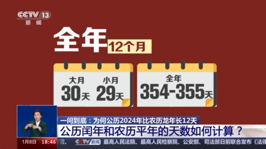 北京天文館副館長 齊銳:公歷是靠觀測太陽的運(yùn)動來得到的這個歷法。因此,地球圍繞太陽運(yùn)動的公轉(zhuǎn)的這個周期,我們天文學(xué)上叫回歸年,這個長度是公歷年長的決定因素。天文學(xué)觀測,我們得知,回歸年的長度是365.2422天,因此這個公歷的年長,就要向這個數(shù)值去逼近。從2024年來看,公歷是閏年,2月有29天,因此它的年長是366天。 農(nóng)歷要考慮月亮的運(yùn)動,因此,每個月它的月長是要看月相的陰晴圓缺的變化周期,朔望月的周期是29天半多一點(diǎn),因此農(nóng)歷的每個月的月長無非就是29天或者是30天,甲辰龍年,它是一個農(nóng)歷上的平年,它這一年只有12個農(nóng)歷月,因此年長是354天。