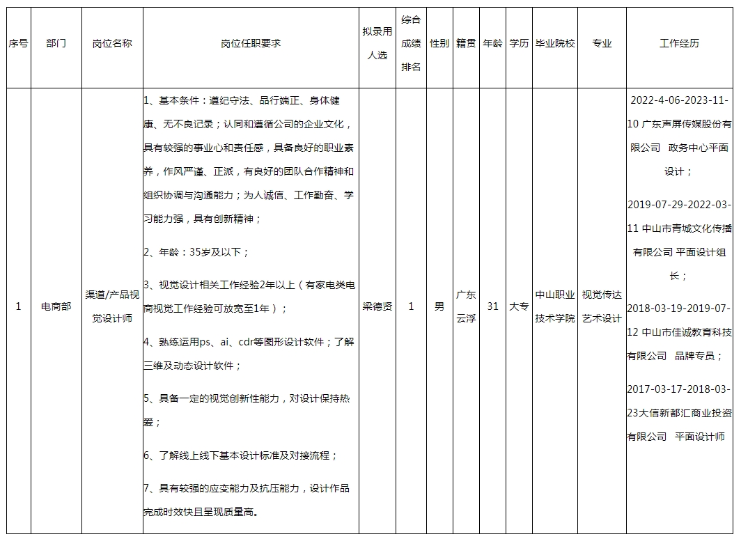 根據(jù)長(zhǎng)虹·美菱國(guó)際區(qū)品牌運(yùn)營(yíng)中心發(fā)布的招聘公告及招聘相關(guān)規(guī)定,經(jīng)面試、考察、體檢等程序,擬錄用梁德賢同志到電商部工作,現(xiàn)予以公示,具體情況如下: