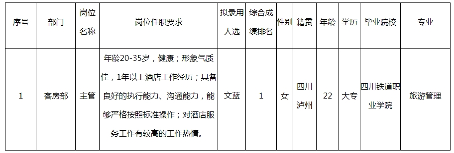 根據(jù)四川長(zhǎng)虹仙海別院酒店發(fā)布的招聘公告及招聘相關(guān)規(guī)定,經(jīng)筆試、面試、考察、體檢等程序,擬錄用文藍(lán)同志到仙海別院酒店工作,現(xiàn)予以公示,具體情況如下: