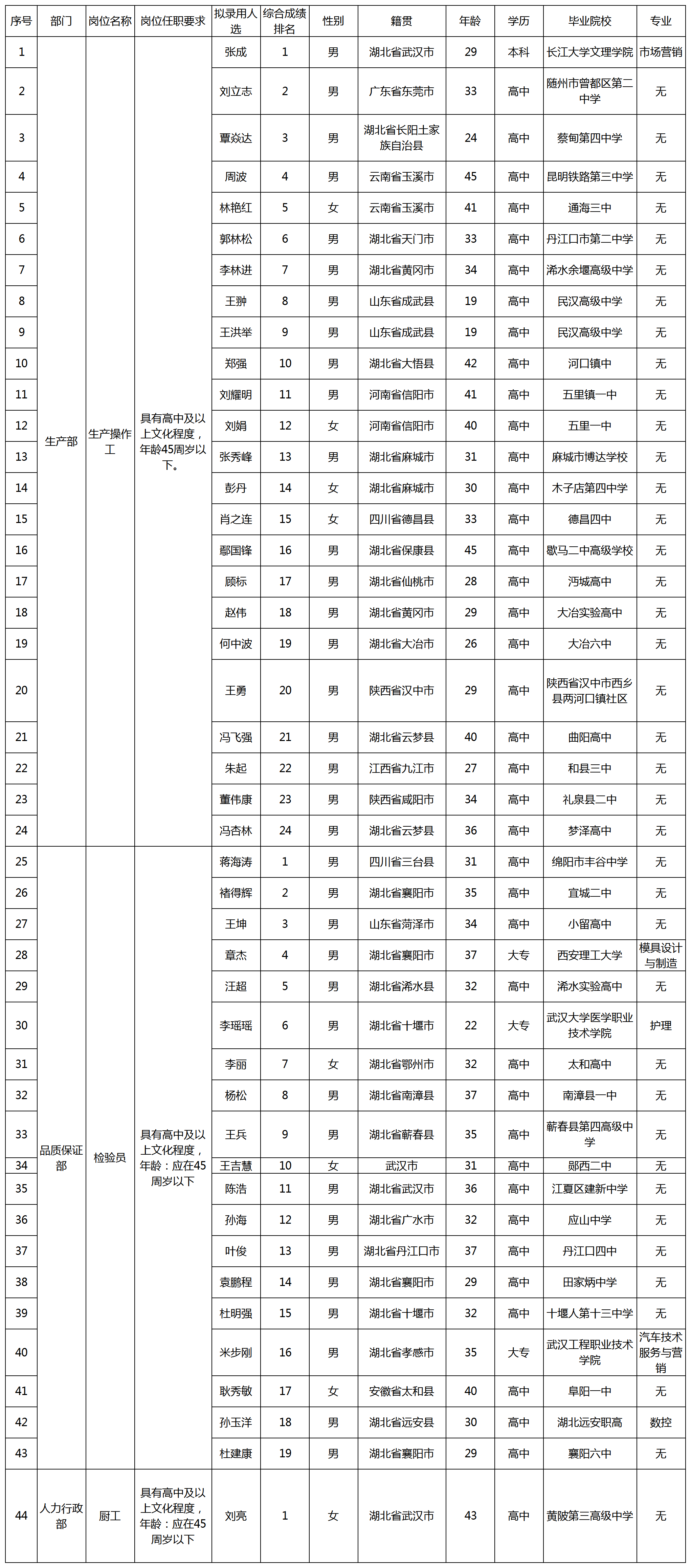 根據(jù)四川波鴻實業(yè)有限公司發(fā)布的招聘公告及招聘相關(guān)規(guī)定,經(jīng)面試、考察、體檢等程序,擬錄用以下人員到威斯卡特工業(yè)(中國)有限公司工作,現(xiàn)予以公示,具體情況如下: