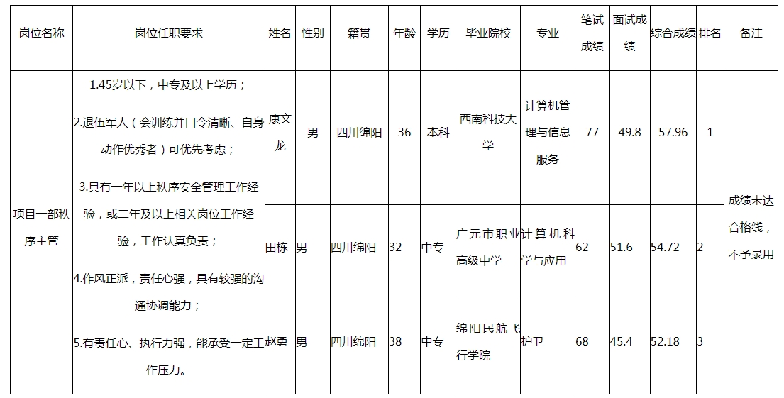 根據(jù)綿陽(yáng)市康來(lái)物業(yè)服務(wù)有限公司發(fā)布的招聘公告及招聘相關(guān)規(guī)定,經(jīng)筆試、面試等程序,現(xiàn)將筆試(面試)成績(jī)予以公示。
