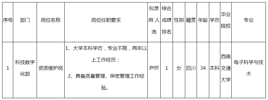 根據(jù)四川科瑞軟件有限責(zé)任公司發(fā)布的招聘公告及招聘相關(guān)規(guī)定,經(jīng)筆試、面試、考察、體檢等程序,擬錄用尹忻同志到四川科瑞軟件有限責(zé)任公司工作,現(xiàn)予以公示,具體情況如下:
