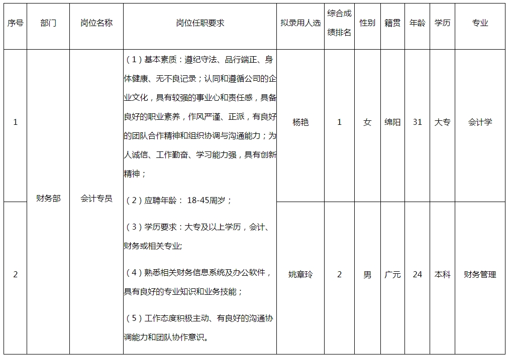 根據(jù)四川長(zhǎng)虹民生物流股份有限公司發(fā)布的招聘公告及招聘相關(guān)規(guī)定,經(jīng)筆試、面試、考察、體檢等程序,擬錄用楊艷等2名同志到四川長(zhǎng)虹民生物流股份有限公司工作,現(xiàn)予以公示,具體情況如下: