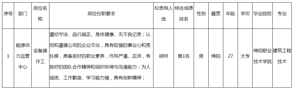 根據(jù)四川長虹電器股份有限公司發(fā)布的招聘公告及招聘相關(guān)規(guī)定,經(jīng)筆試、面試、考察、體檢等程序,擬錄用胡珂同志到能源動(dòng)力運(yùn)營中心工作,現(xiàn)予以公示,具體情況如下: