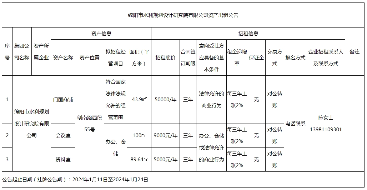 綿陽市水利規(guī)劃設(shè)計研究院有限公司資產(chǎn)出租公告