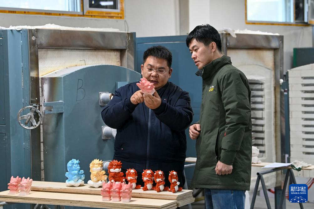 在位于山西省長治市上黨區(qū)紅綠彩村的生產(chǎn)基地內(nèi),李亞敏(左)和工作人員交流(1月4日攝)。