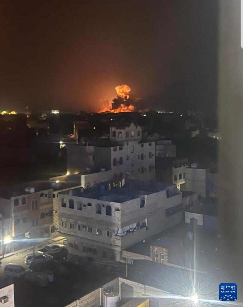 這是1月12日在也門首都薩那拍攝的空襲后的爆炸畫面(手機照片)。新華社發(fā)