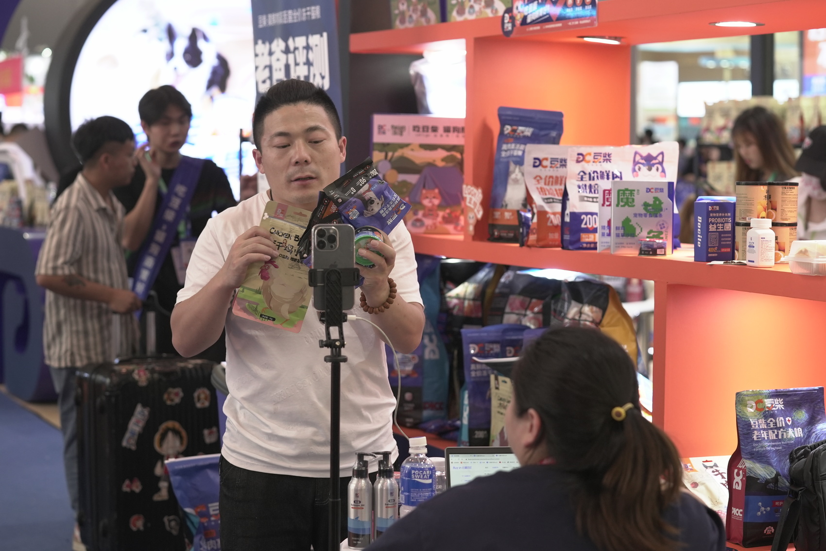 成都寵博會(huì)上正在直播售賣(mài)商品的人。