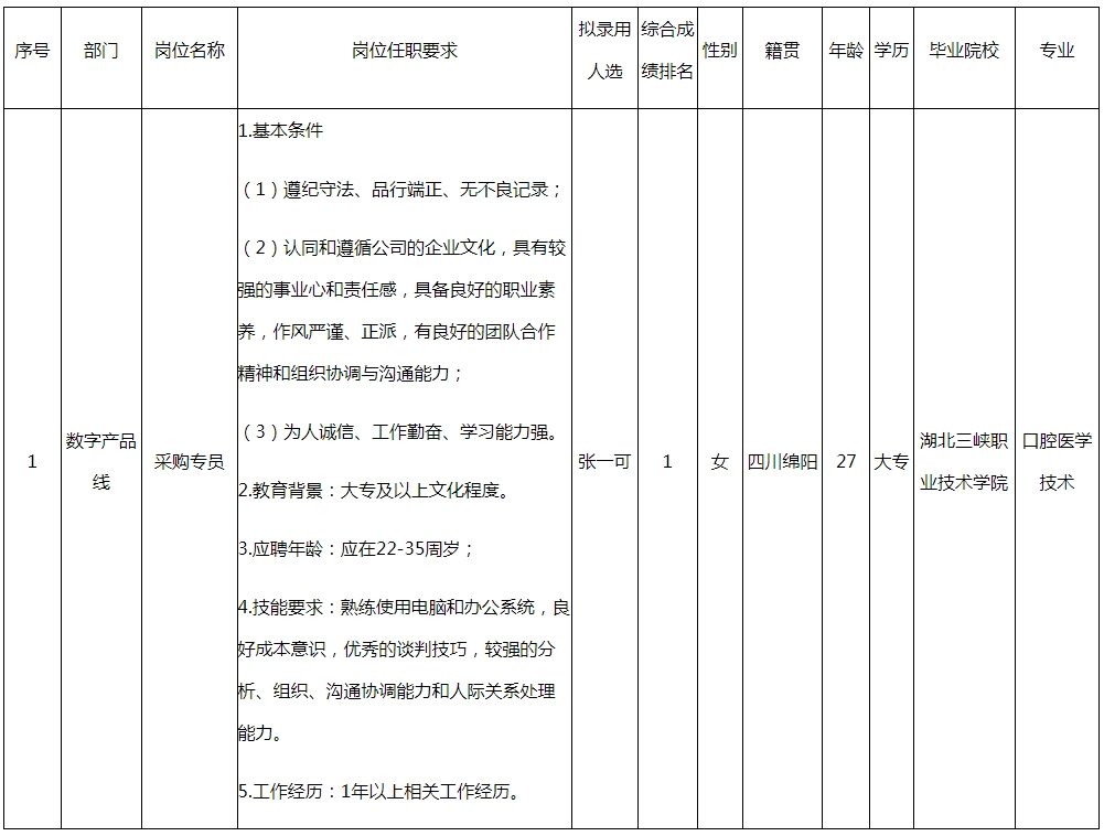 根據(jù)四川九州光電子技術(shù)有限公司發(fā)布的招聘公告及招聘相關(guān)規(guī)定,經(jīng)面試、考察、體檢等程序,擬錄用張一可同志到四川九州光電子技術(shù)有限公司工作,現(xiàn)予以公示,具體情況如下: