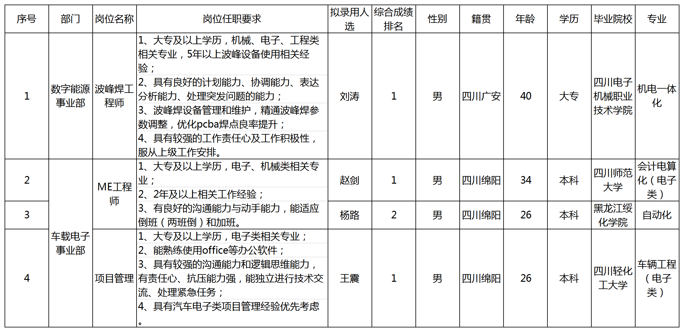 根據(jù)四川九州電子科技股份有限公司發(fā)布的招聘公告及招聘相關(guān)規(guī)定,經(jīng)筆試、面試、考察、體檢等程序,擬錄用劉濤等4名同志到四川九州電子科技股份有限公司工作,現(xiàn)予以公示,具體情況如下: