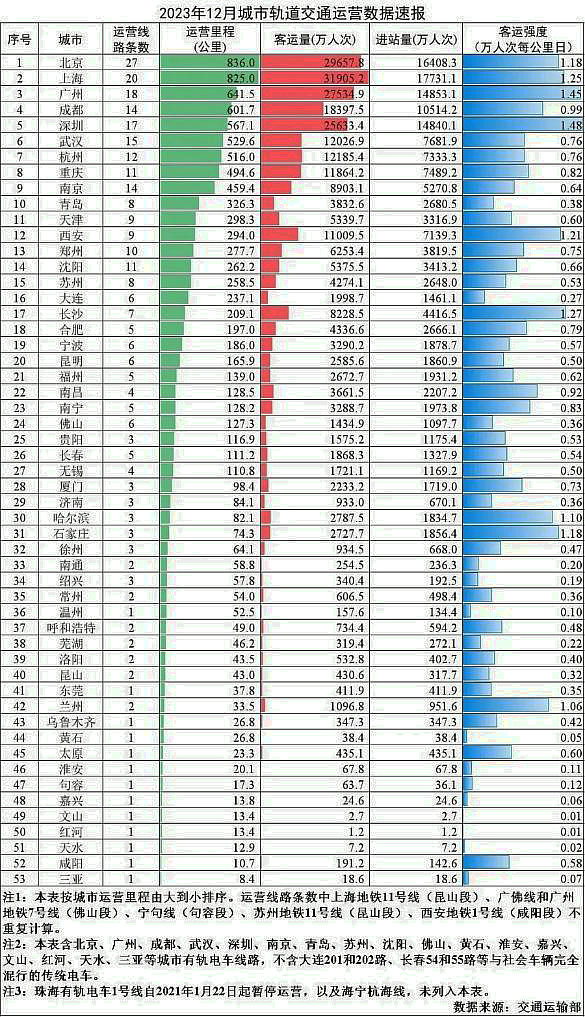 據(jù)交通運(yùn)輸部有關(guān)負(fù)責(zé)人介紹,2023年12月,我國(guó)城市軌道交通新增運(yùn)營(yíng)里程250.1公里,新增運(yùn)營(yíng)線(xiàn)路6條,為武漢地鐵19號(hào)線(xiàn)、重慶地鐵18號(hào)線(xiàn)、天津地鐵11號(hào)線(xiàn)、鄭州地鐵12號(hào)線(xiàn)、貴陽(yáng)地鐵3號(hào)線(xiàn)、南通地鐵2號(hào)線(xiàn);新增運(yùn)營(yíng)區(qū)段11個(gè),為北京地鐵11號(hào)線(xiàn)西段剩余段、北京地鐵16號(hào)線(xiàn)剩余段、北京地鐵17號(hào)線(xiàn)北段、廣州地鐵5號(hào)線(xiàn)東延段、廣州地鐵7號(hào)線(xiàn)二期、深圳地鐵8號(hào)線(xiàn)二期、武漢地鐵5號(hào)線(xiàn)調(diào)整工程、南京地鐵7號(hào)線(xiàn)南段、合肥地鐵2號(hào)線(xiàn)延長(zhǎng)線(xiàn)、合肥地鐵3號(hào)線(xiàn)延長(zhǎng)線(xiàn)、哈爾濱地鐵3號(hào)線(xiàn)二期西北半環(huán)(中華巴洛克街區(qū)站至北馬路站)。