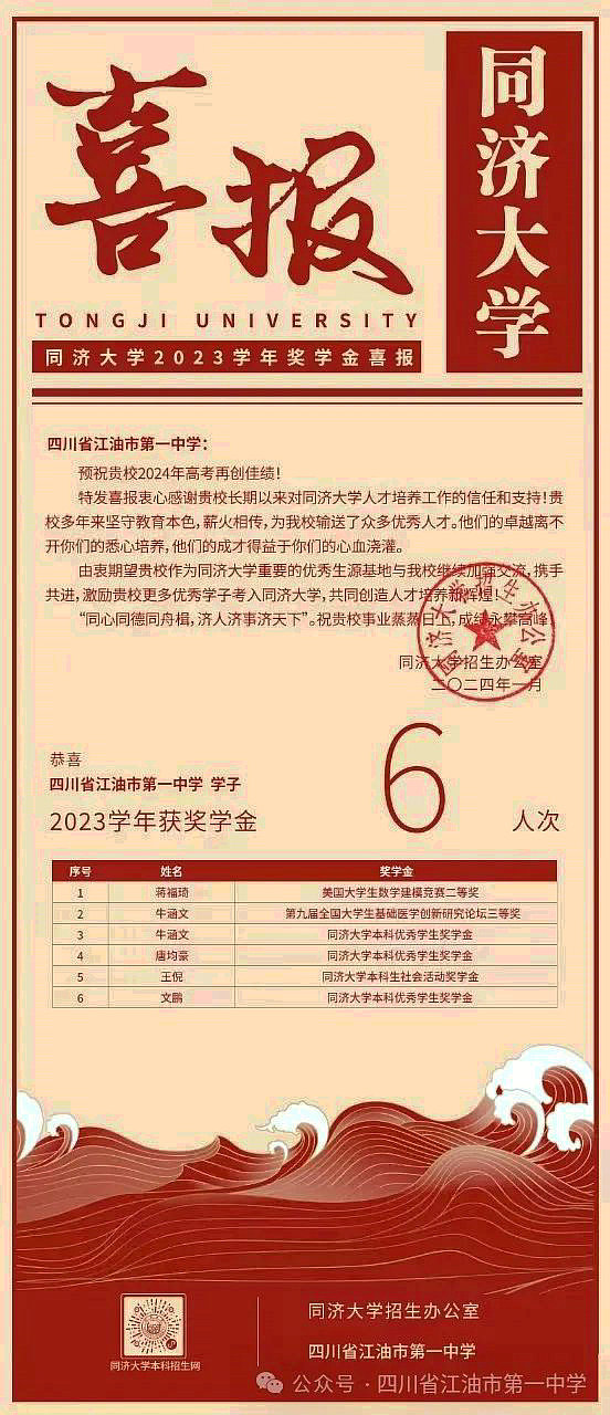 同濟大學的喜報是對江油一中長期以來培養(yǎng)優(yōu)秀拔尖人才所作貢獻的最好印證。江油一中一直秉持“特色發(fā)展、多元發(fā)展、全面發(fā)展”的理念,堅守教育初心,傳承薪火,不斷為國家輸送優(yōu)秀學子。蔣福琦等5名同學的優(yōu)異表現(xiàn)得到了同濟大學的充分肯定。