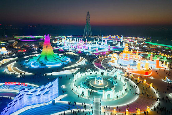 游客在哈爾濱冰雪大世界園區(qū)內(nèi)游玩(無人機(jī)照片,1月9日攝)。新華社記者 張濤 攝