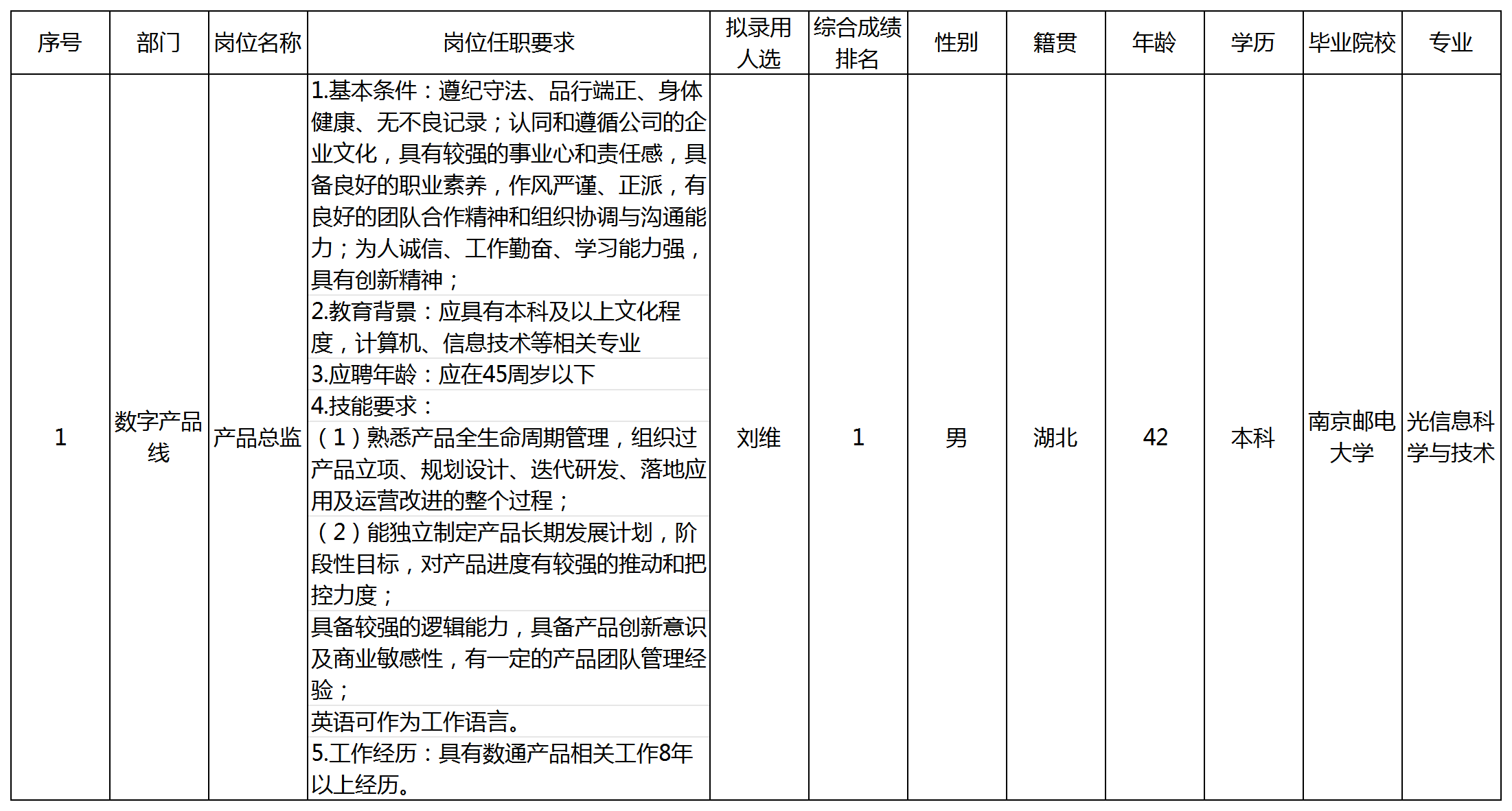 根據(jù)深圳市九洲電器有限公司發(fā)布的招聘公告及招聘相關規(guī)定,經(jīng)筆試、面試、考察、體檢等程序,擬錄用劉維同志到深圳市九洲電器有限公司工作,現(xiàn)予以公示,具體情況如下: