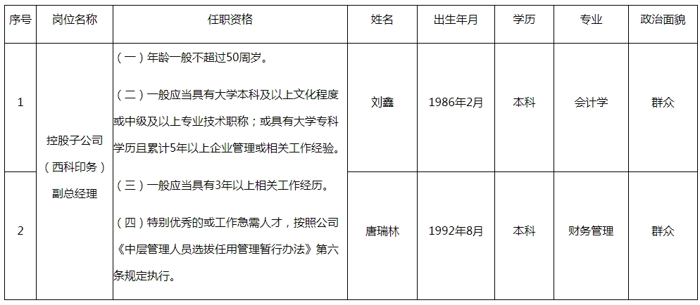 根據(jù)綿陽交發(fā)實(shí)業(yè)有限責(zé)任公司《控股子公司(西科印務(wù))副總經(jīng)理競爭上崗公告》相關(guān)要求,現(xiàn)將資格審查通過的報(bào)名人員予以公示(以姓氏筆畫為序)。