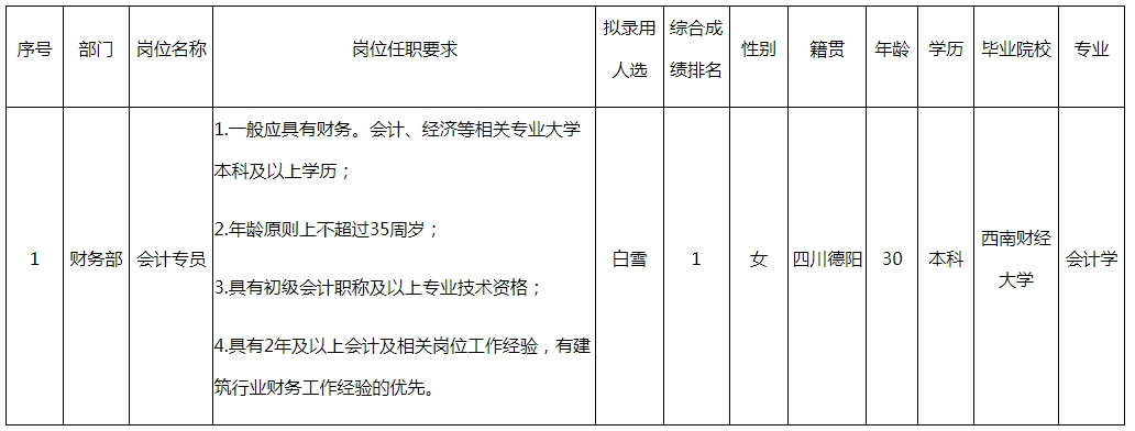 根據(jù)綿陽路橋建設(shè)有限責(zé)任公司發(fā)布的招聘公告及招聘相關(guān)規(guī)定,經(jīng)筆試、面試、考察、體檢等程序,擬錄用白雪同志到綿陽路橋建設(shè)有限責(zé)任公司工作,現(xiàn)予以公示,具體情況如下: