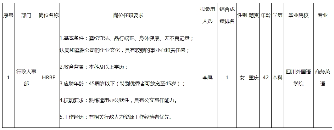 根據(jù)四川長(zhǎng)虹空調(diào)有限公司發(fā)布的招聘公告及招聘相關(guān)規(guī)定,經(jīng)面試、考察、體檢等程序,擬錄用李鳳到長(zhǎng)虹空調(diào)工作,現(xiàn)予以公示,具體情況如下: