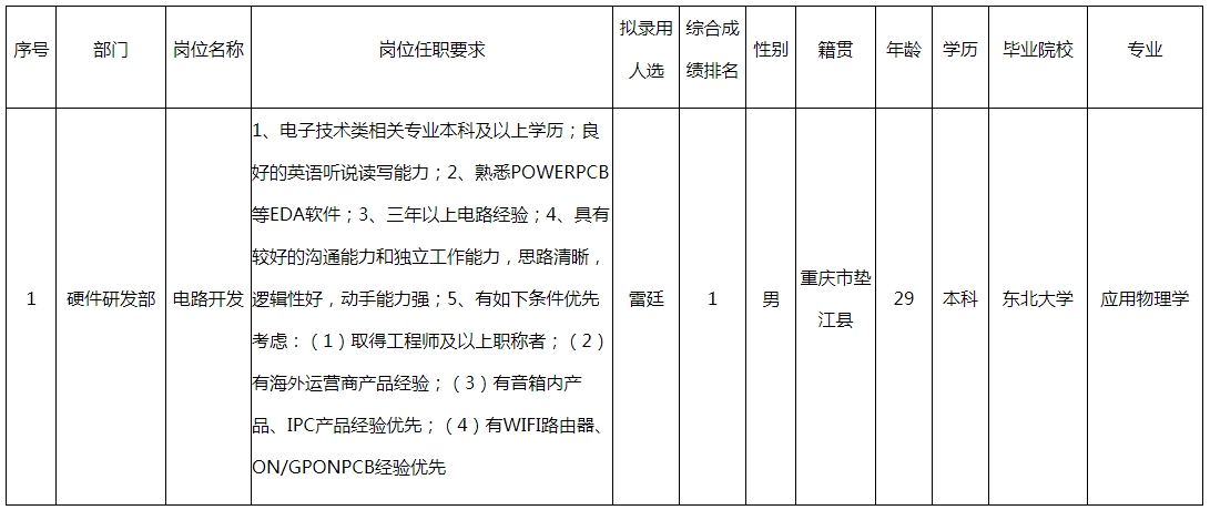 根據(jù)四川長虹網(wǎng)絡(luò)科技有限責(zé)任公司發(fā)布的招聘公告及招聘相關(guān)規(guī)定,經(jīng)筆試、面試、考察、體檢等程序,擬錄用雷廷同志到硬件研發(fā)部,現(xiàn)予以公示,具體情況如下:
