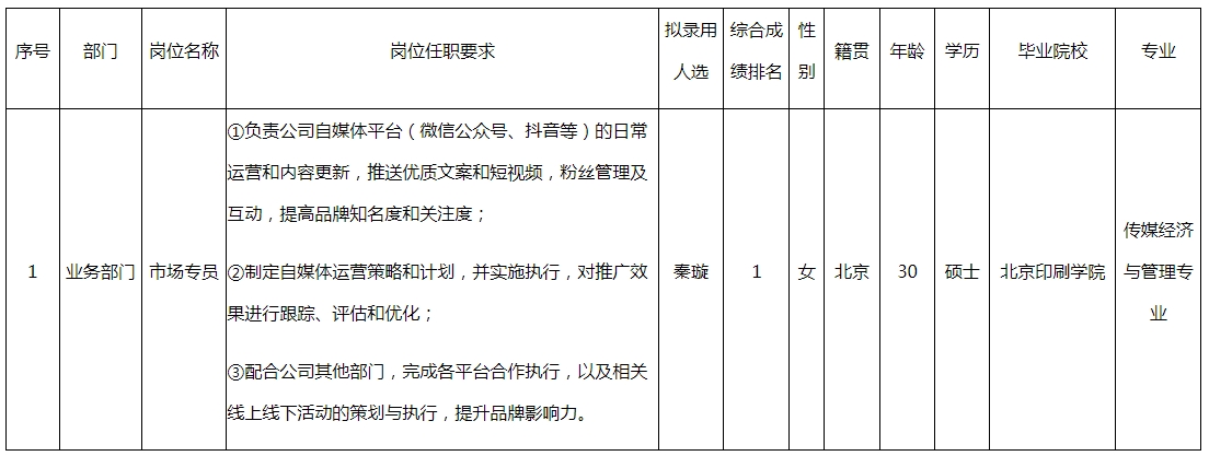 根據(jù)四川長虹佳華信息產(chǎn)品有限責(zé)任公司發(fā)布的招聘公告及招聘相關(guān)規(guī)定,經(jīng)筆試、面試、考察、體檢等程序,擬錄用秦璇同志到四川長虹佳華信息產(chǎn)品有限責(zé)任公司工作,現(xiàn)予以公示,具體情況如下: