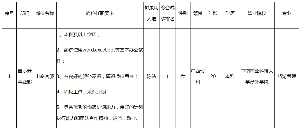 根據(jù)廣東長虹電子有限公司發(fā)布的招聘公告及招聘相關(guān)規(guī)定,經(jīng)面試、考察、體檢等程序,擬錄用陳潔同志到顯示器事業(yè)部工作,現(xiàn)予以公示,具體情況如下: