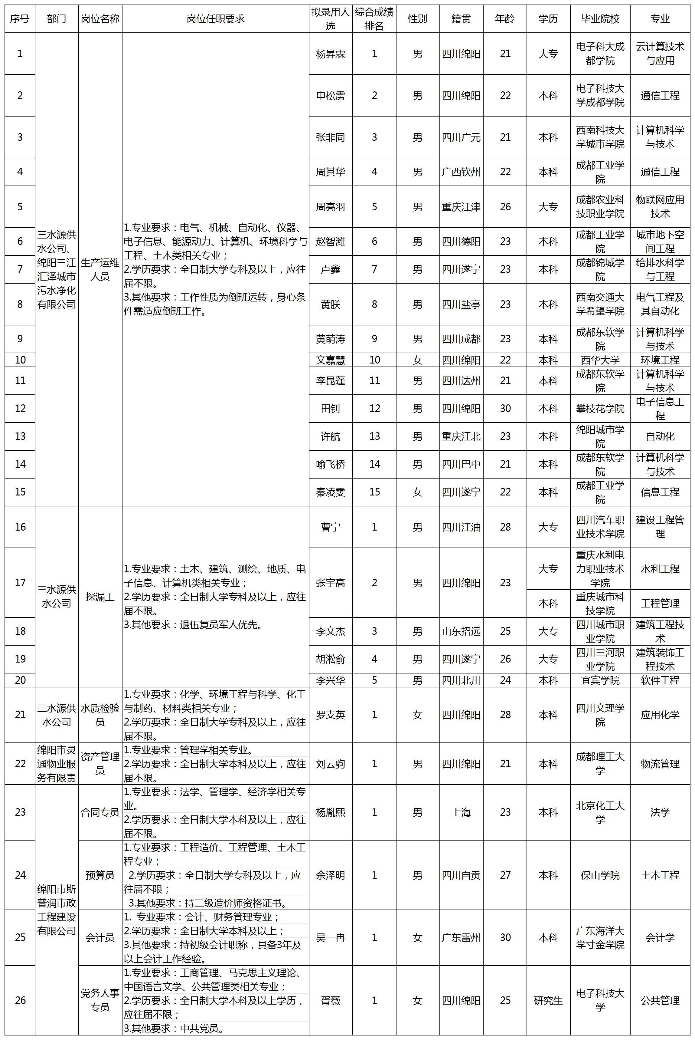 根據(jù)綿陽市水務(wù)(集團(tuán))有限公司發(fā)布的招聘公告及招聘相關(guān)規(guī)定,經(jīng)筆試、面試、考察、體檢等程序,擬錄用以下26名同志到綿陽市水務(wù)(集團(tuán))有限公司工作,現(xiàn)予以公示,具體情況如下:
