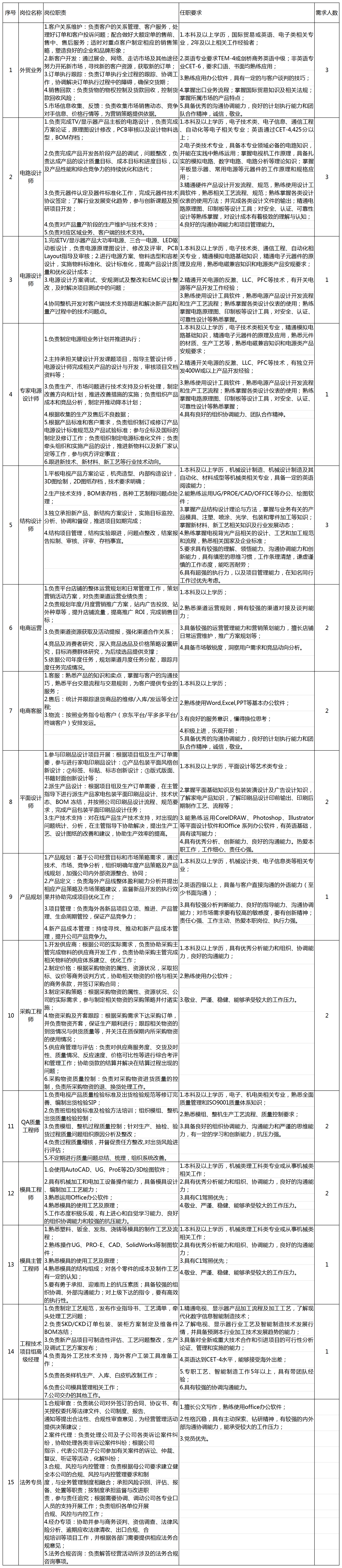 根據(jù)公司經(jīng)營管理需要,現(xiàn)面向公司外部公開招聘,崗位情況及需求人數(shù)如下: