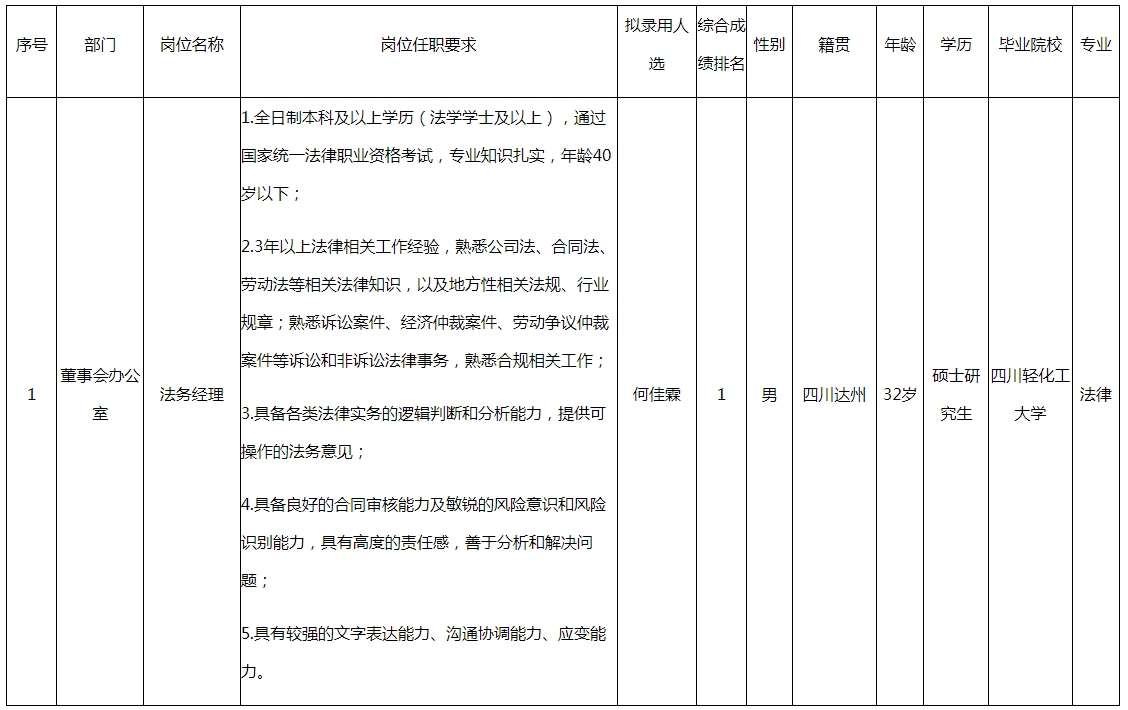 根據(jù)四川愛聯(lián)科技股份有限公司發(fā)布的招聘公告及招聘相關規(guī)定,經(jīng)筆試、面試、考察、體檢等程序,擬錄用何佳霖同志到董事會辦公室任職法務經(jīng)理,現(xiàn)予以公示,具體情況如下: