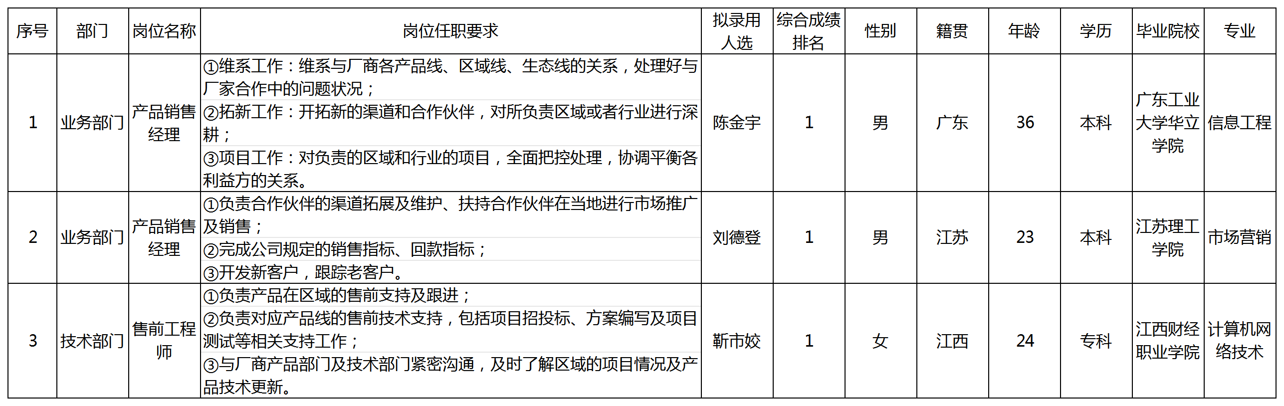 根據(jù)四川長虹佳華信息產(chǎn)品有限責任公司發(fā)布的招聘公告及招聘相關規(guī)定,經(jīng)筆試、面試、考察、體檢等程序,擬錄用陳金宇、劉德登、靳市姣同志到四川長虹佳華信息產(chǎn)品有限責任公司工作,現(xiàn)予以公示,具體情況如下: