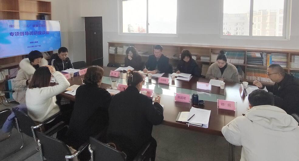 接著,在該校教師書(shū)吧召開(kāi)了綿陽(yáng)市“正心”健康工程專(zhuān)項(xiàng)督導(dǎo)調(diào)研涪城工作座談會(huì)。座談會(huì)分為三個(gè)環(huán)節(jié),第一環(huán)節(jié),該校從制度建設(shè)重保障、心理篩查重關(guān)注、心理班會(huì)重建設(shè)、心理委員重指導(dǎo)、心理專(zhuān)家重體驗(yàn)、家校共育心橋梁、個(gè)案輔導(dǎo)重幫扶七個(gè)方面向與會(huì)人員作了專(zhuān)題匯報(bào)。第二環(huán)節(jié),涪城區(qū)教體局基教股股長(zhǎng)張丹從健全“正心”健康工程機(jī)制、全區(qū)隊(duì)伍建設(shè)、智慧心育平臺(tái)、心理課程建設(shè)等方面向與會(huì)者作了匯報(bào)。最后,涪城區(qū)民政局主任張進(jìn)向督導(dǎo)組一行匯報(bào)涪城各部門(mén)聯(lián)動(dòng)強(qiáng)有力推進(jìn)“正心”健康工程的情況。第三環(huán)節(jié),綿陽(yáng)市第三人民醫(yī)院臨床心理科主任金敏充分肯定了該校及涪城區(qū)開(kāi)展“正心”健康工程所作的努力。她認(rèn)為,學(xué)校在人員緊張的情況下,這個(gè)專(zhuān)業(yè)地開(kāi)展了系列工作,值得表?yè)P(yáng)。胥執(zhí)東調(diào)研員說(shuō)明了此次督導(dǎo)的意義,對(duì)該校就“正心”健康工程所做的各項(xiàng)工作給予了高度評(píng)價(jià),充分肯定了該校開(kāi)展的此項(xiàng)工作,特別是學(xué)校重視篩查和困難幫扶,工作點(diǎn)位正確。胥執(zhí)東也向涪城區(qū)提出了心理工作系統(tǒng)化推進(jìn)和重視心理教師的歸屬感等方面的建議。
