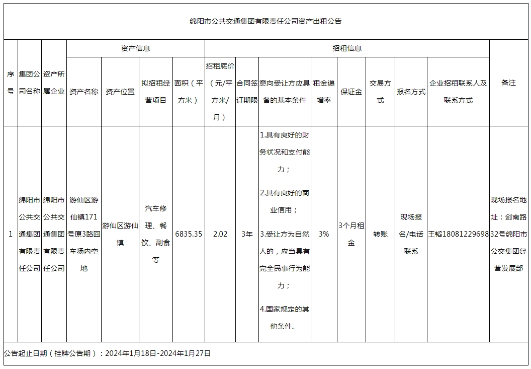 綿陽市公共交通集團有限責任公司資產出租公告