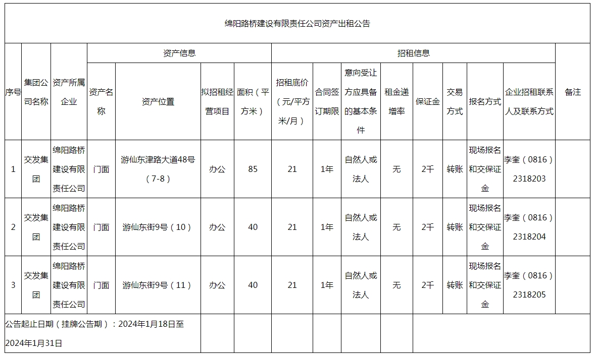 綿陽路橋建設有限責任公司資產(chǎn)出租公告