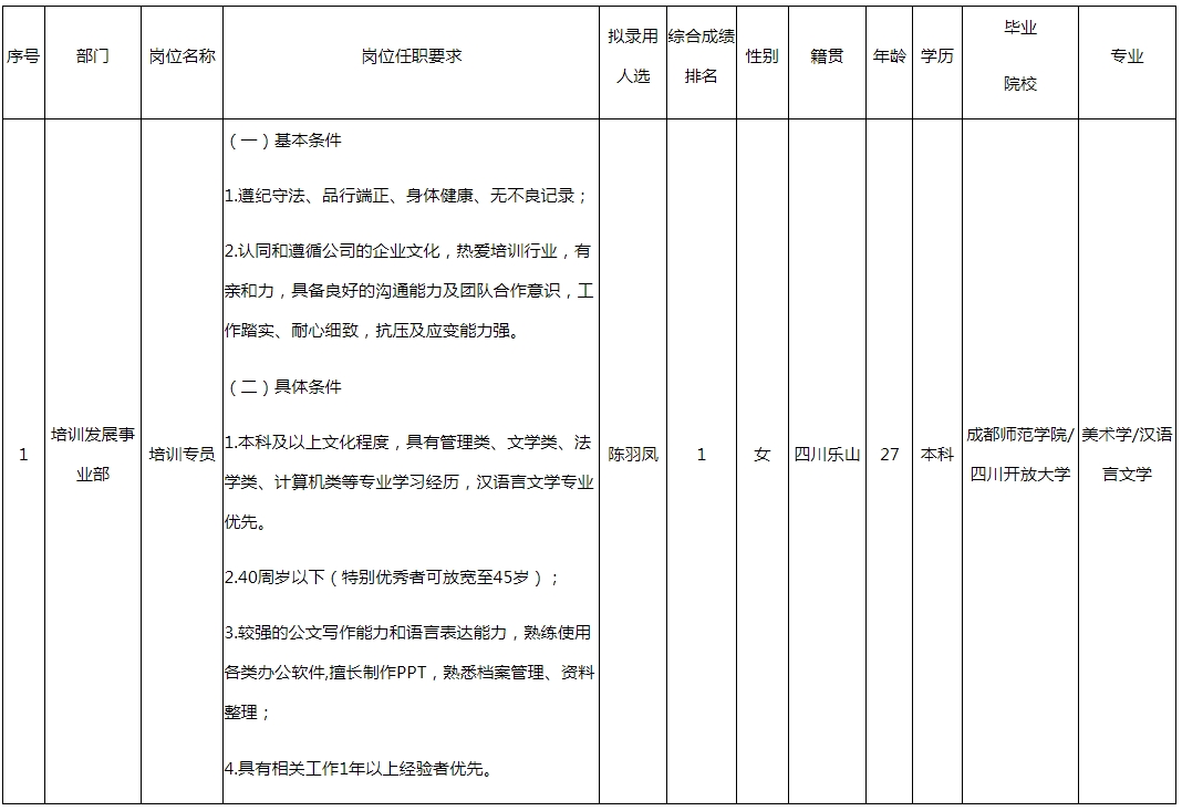 根據(jù)四川九洲教育投資管理有限公司發(fā)布的招聘公告及招聘相關規(guī)定,經(jīng)筆試、面試、考察、體檢等程序,擬錄用陳羽鳳同志到四川九洲教育投資管理有限公司工作,現(xiàn)予以公示,具體情況如下: