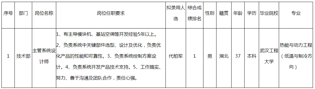 根據(jù)宏源地能熱泵科技(中山)有限公司發(fā)布的招聘公告及招聘相關(guān)規(guī)定,經(jīng)筆試、面試、考察、體檢等程序,擬錄用代柏軍同志到技術(shù)部主管系統(tǒng)設(shè)計師工作,現(xiàn)予以公示,具體情況如下:
