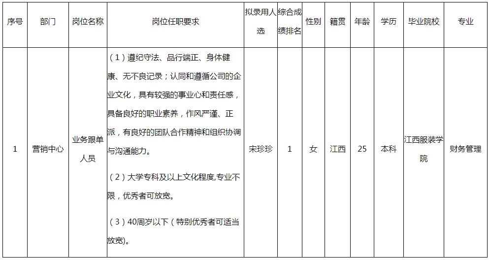 根據(jù)深圳長(zhǎng)虹聚和源科技有限公司發(fā)布的招聘公告及招聘相關(guān)規(guī)定,經(jīng)筆試、面試、考察、體檢等程序,擬錄用宋珍珍同志到公司營(yíng)銷(xiāo)中心工作,現(xiàn)予以公示,具體情況如下: