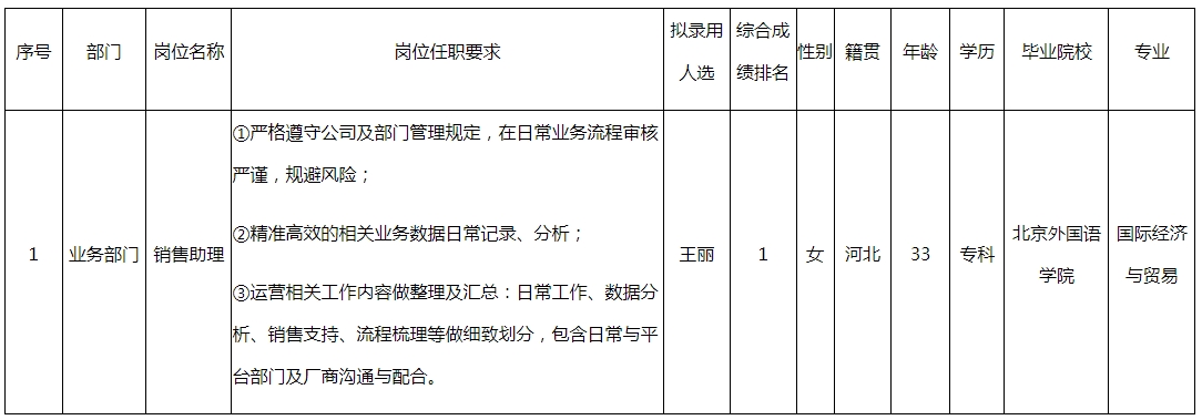 根據(jù)四川長(zhǎng)虹佳華信息產(chǎn)品有限責(zé)任公司發(fā)布的招聘公告及招聘相關(guān)規(guī)定,經(jīng)筆試、面試、考察、體檢等程序,擬錄用王麗同志到四川長(zhǎng)虹佳華信息產(chǎn)品有限責(zé)任公司工作,現(xiàn)予以公示,具體情況如下: