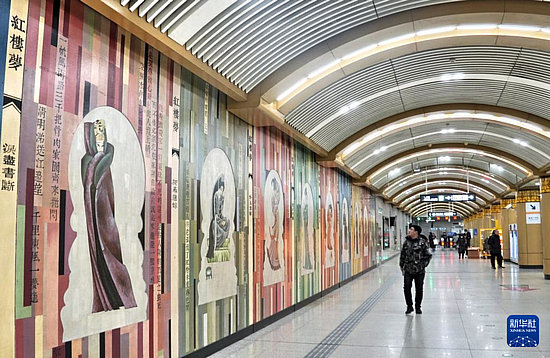 乘客在磁器口地鐵站內(nèi)觀看“紅樓夢”壁畫(1月20日攝)。